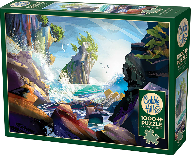 Experience the power of the ocean with "Coastal Waves," a 1000 piece puzzle that captures the abstract beauty of nature. This puzzle by Dale Hitchcox showcases a rocky cliff with rushing waves crashing against its base, set against a backdrop of clear blue skies and graceful birds in flight. In the distance a rock formation juts out of the water with beautiful green trees crowning it. With some dark purple and black areas framing the puzzle, it could be a tricky one to solve for some. The blue and white bring peace to the puzzle, but it may not bring reprieve. An overall challenging puzzle with beautiful results.