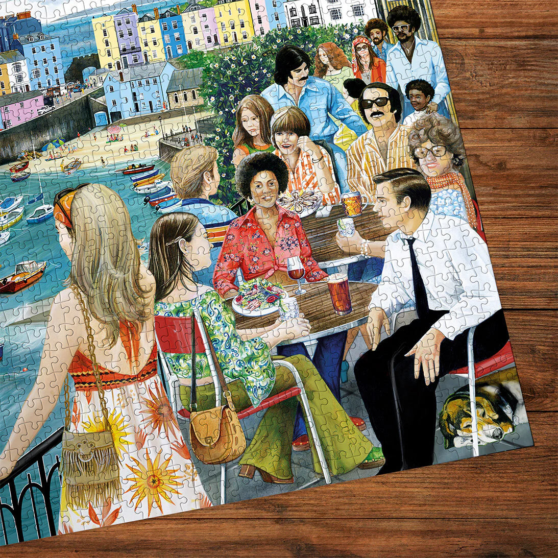 This beautiful 1000 piece jigsaw puzzle painted by Fiona Osbaldstone invites you to a serene seaside escape, where laughter and clinking glasses fill a cozy restaurant overlooking the endless blue.