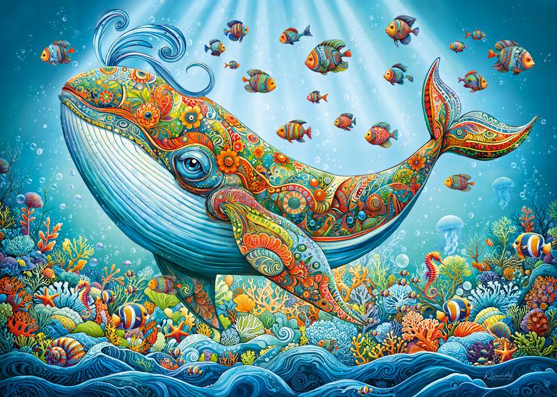 Here is an extraordinary and unique puzzle that features a majestic whale with a friendly expression that is adorned with colourful floral and paisley patterns, creating a dreamlike marine environment. The unique art style blends whimsical details, giving the whale fantastical aura. This is true joyful scene with a lovely Prince of whales.
